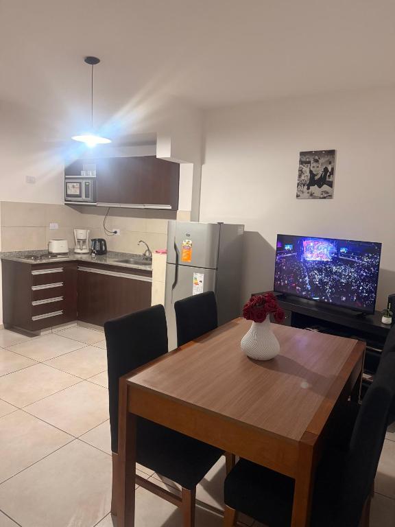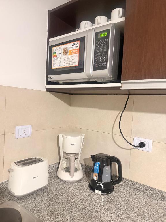 Zona de cocina, Nevera, Microondas, Cocina, Productos de limpieza, Cafetera, Mesa de comedor, Copas de vino