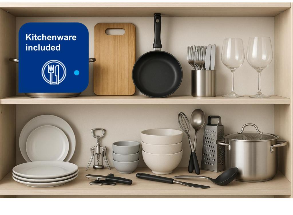 Zona de cocina, Nevera, Microondas, Cocina, Hervidor eléctrico, Utensilios de cocina, Secadora de ropa, Horno, Fogones, Tostadora, Productos de limpieza, Cafetera, Mesa de comedor, Copas de vino