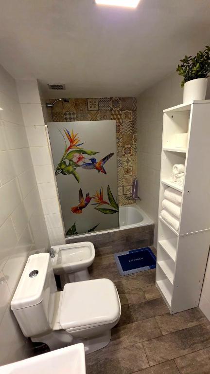 Ducha, Secador de pelo, WC, Bidet, Toallas, Papel higiénico