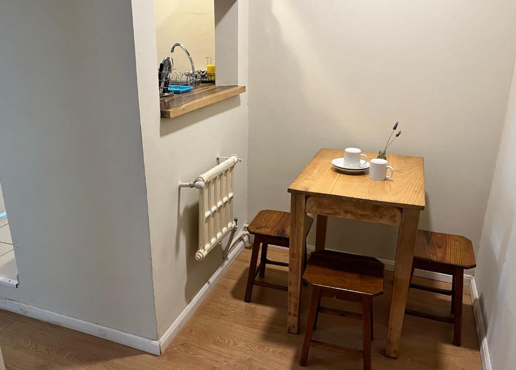 Zona de cocina, Nevera, Microondas, Hervidor eléctrico, Utensilios de cocina, Productos de limpieza, Mesa de comedor