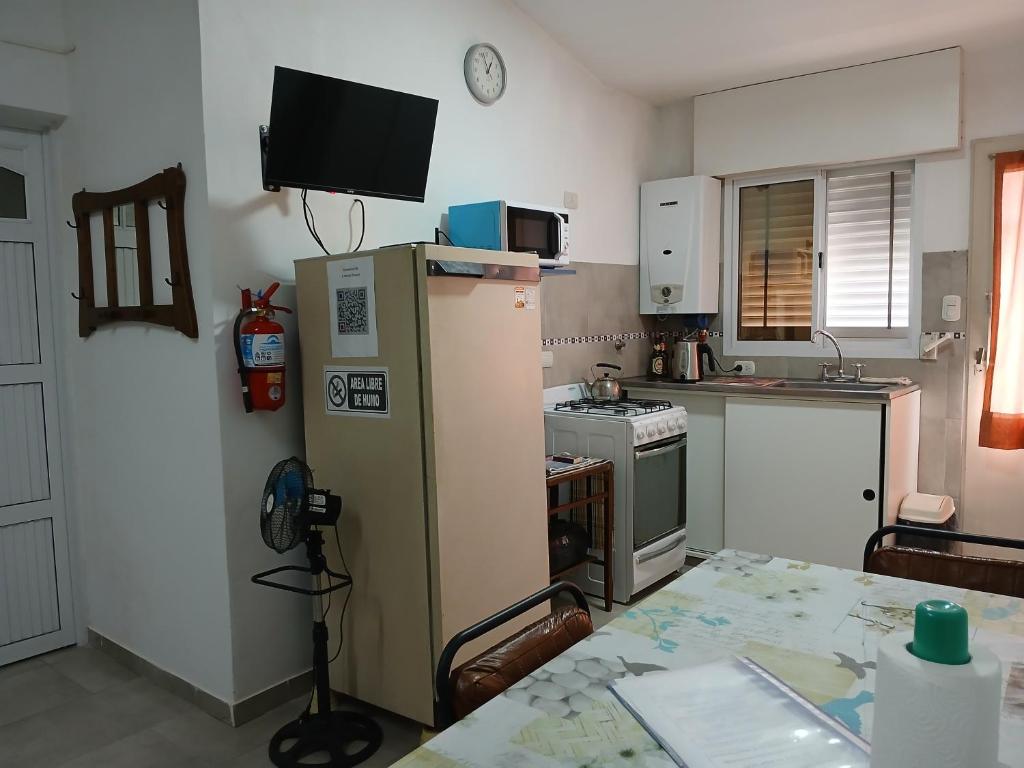 Zona de cocina, Nevera, Microondas, Cocina, Hervidor eléctrico, Utensilios de cocina, Horno, Fogones, Tostadora, Cafetera, Mesa de comedor
